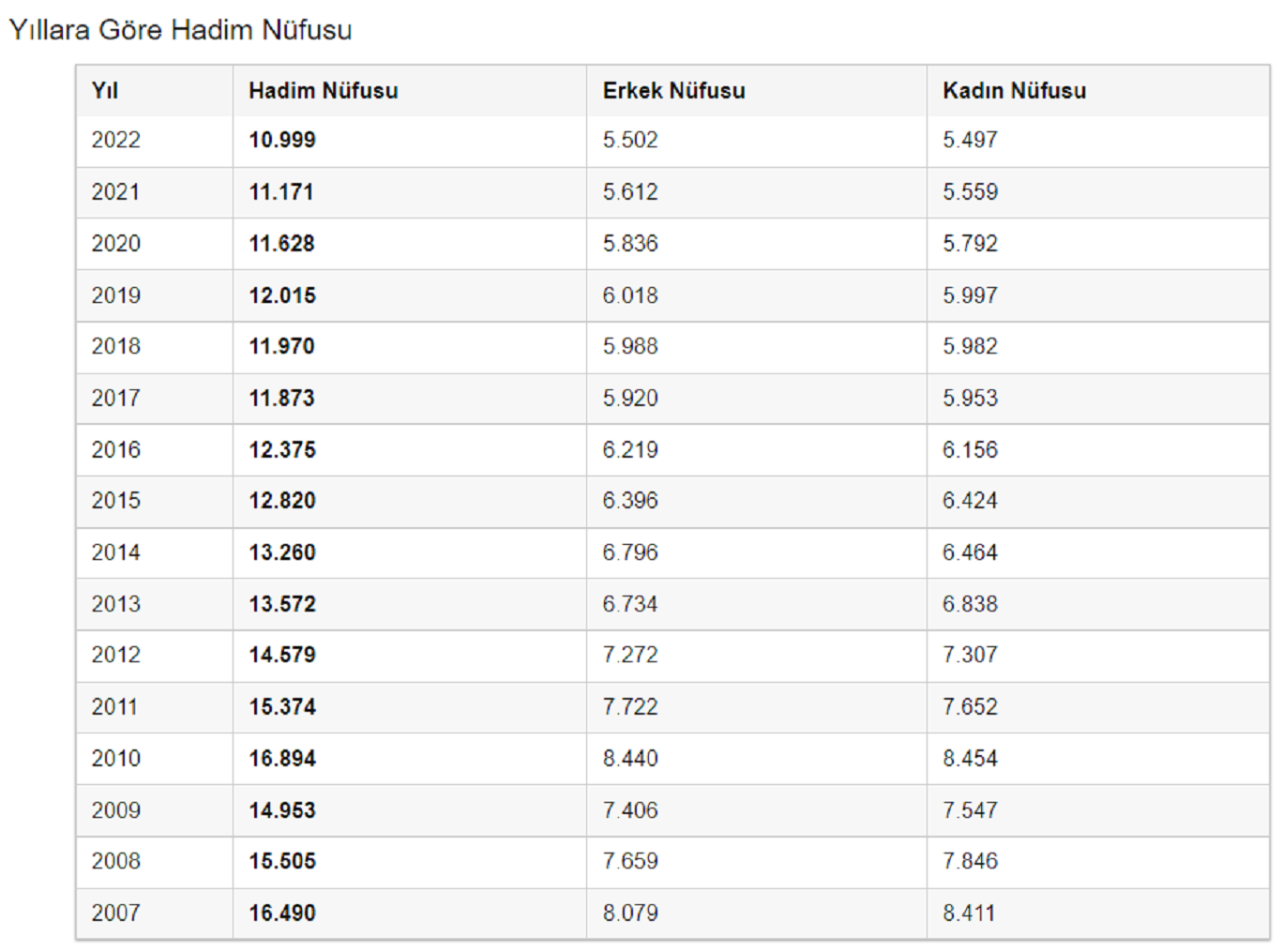 Hadim’in nüfusu, bir önceki yıla göre 172 kişi azalarak 10.999 kişiye düştü.
